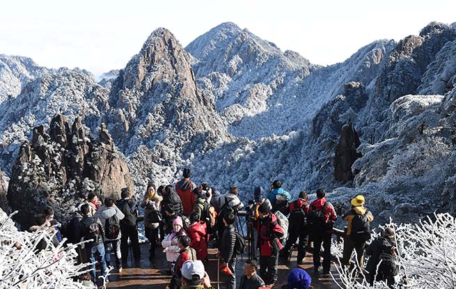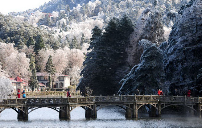 湖南南岳衡山现雾凇云海 房屋建筑披冰甲